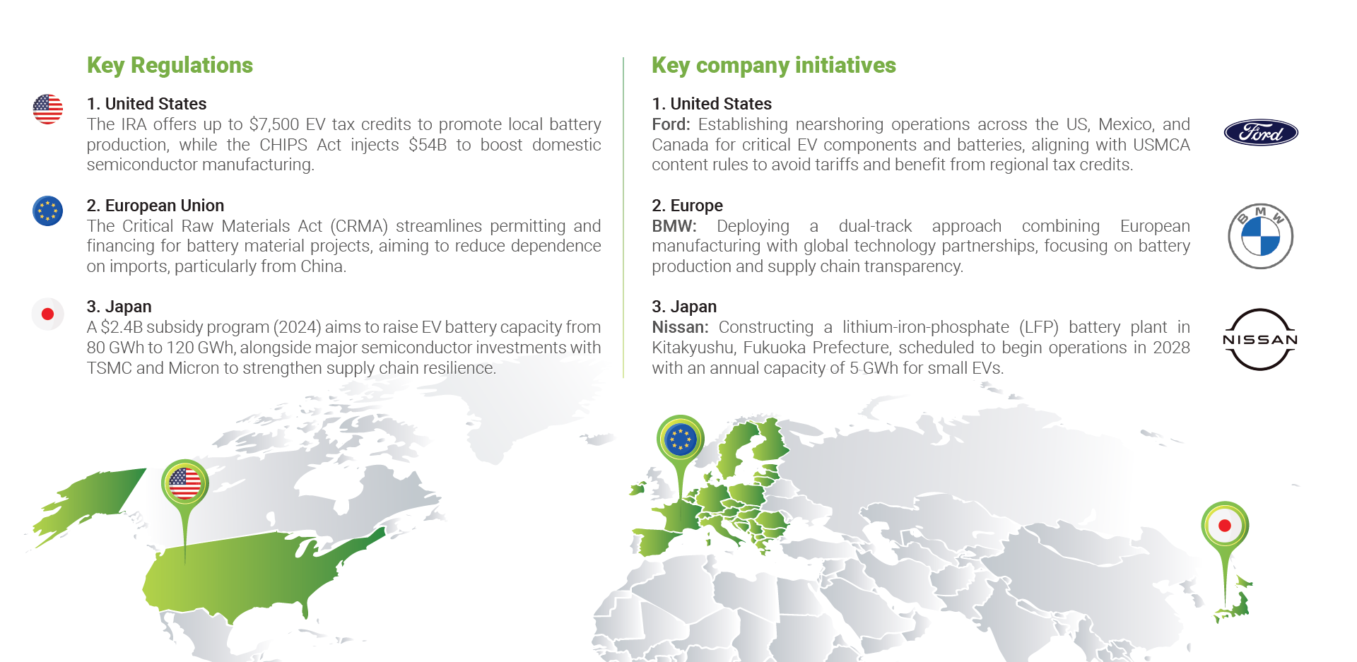 The 2021 semiconductor shortage, which forced major OEMs like Toyota to cut nearly 40% of global output, underscored the risk of overreliance on offshore production. Governments are responding, too, with incentives supporting domestic sourcing and regional manufacturing, from Japan’s EV-battery programs to the U.S. Inflation Reduction Act.